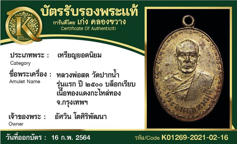 เหรียญหลวงพ่อสด วัดปากน้ำ รุ่นแรก ปี 2500 บล็อกเรียบ