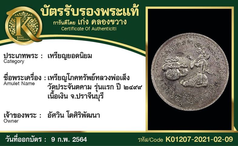 เหรียญโภคทรัพย์หลวงพ่อเส็ง วัดประจันตคาม รุ่นแรก