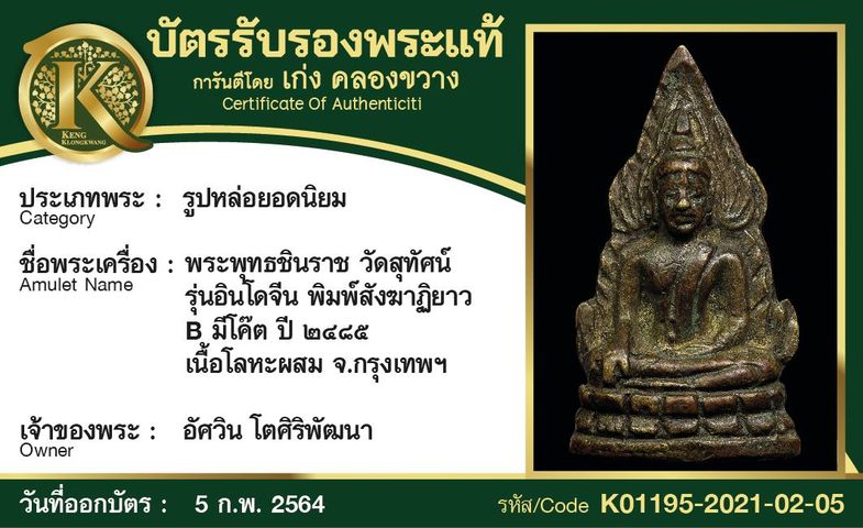 พระพุทธชินราช วัดสุทัศน์ รุ่นอินโดจีน พิมพ์สังฆาฏิยาว B มีโค๊ต