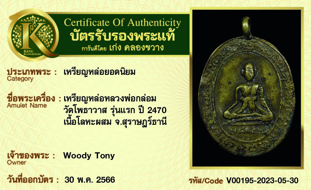 เหรียญหล่อหลวงพ่อกล่อม วัดโพธาวาส รุ่นแรก ปี 2470 เนื้อโลหะผสม จ.สุราษฎร์ธานี