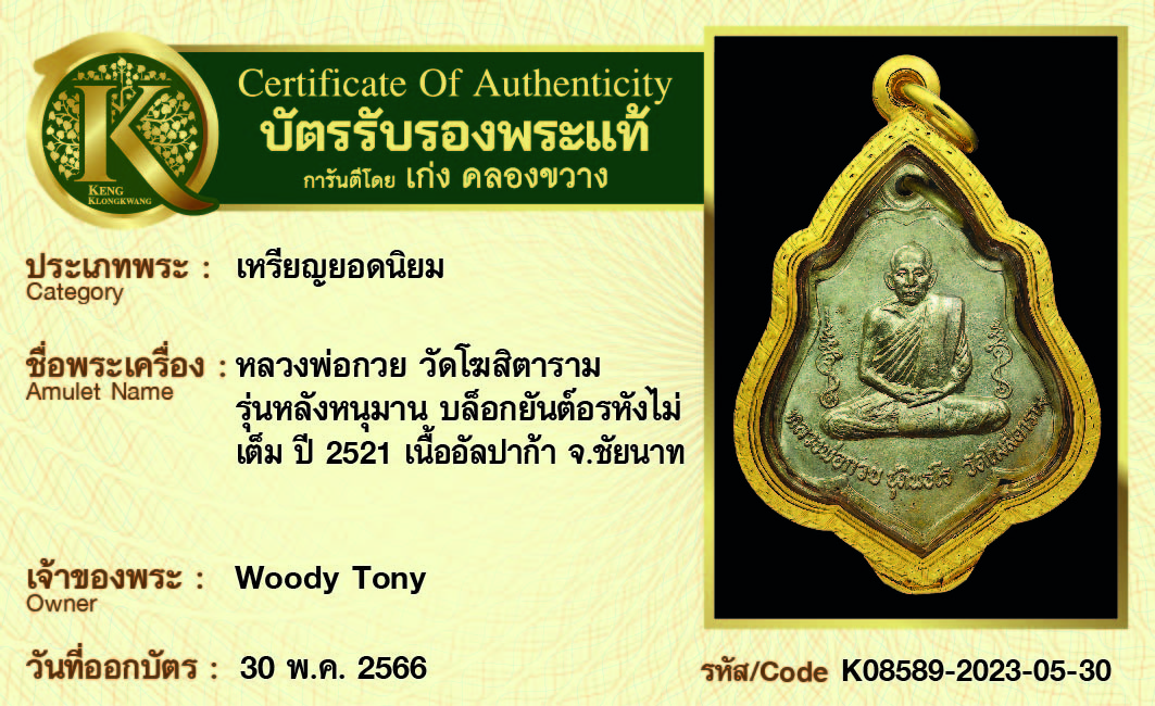 เหรียญหลวงพ่อกวย วัดโฆสิตาราม รุ่น 3 หลังหนุมาน บล็อกยันต์อรหังไม่เต็ม ปี 2521 เนื้ออัลปาก้า จังหวัดชัยนาท