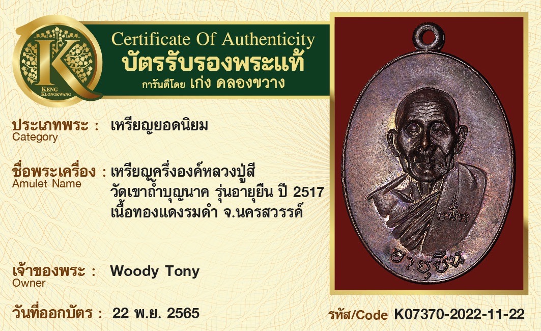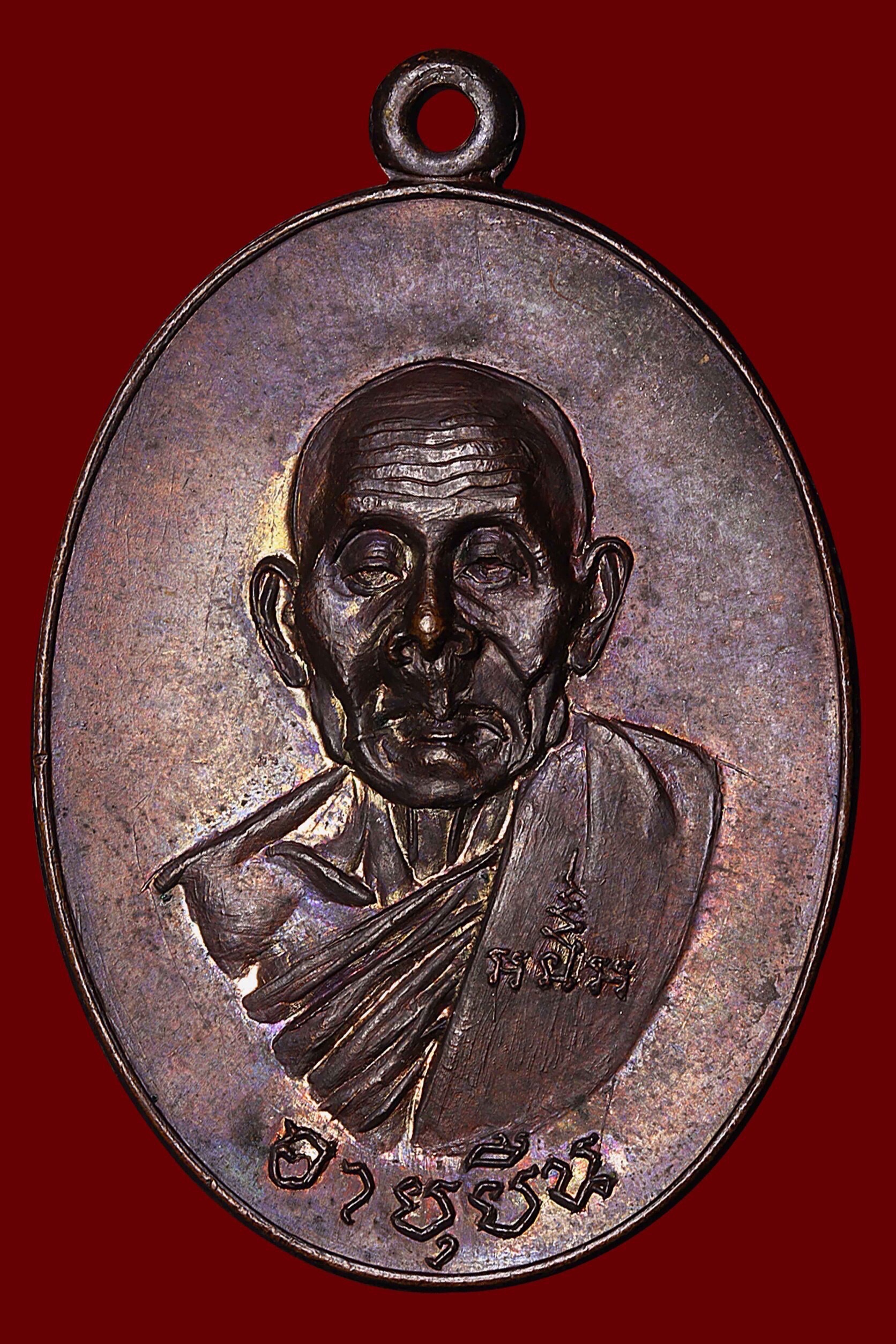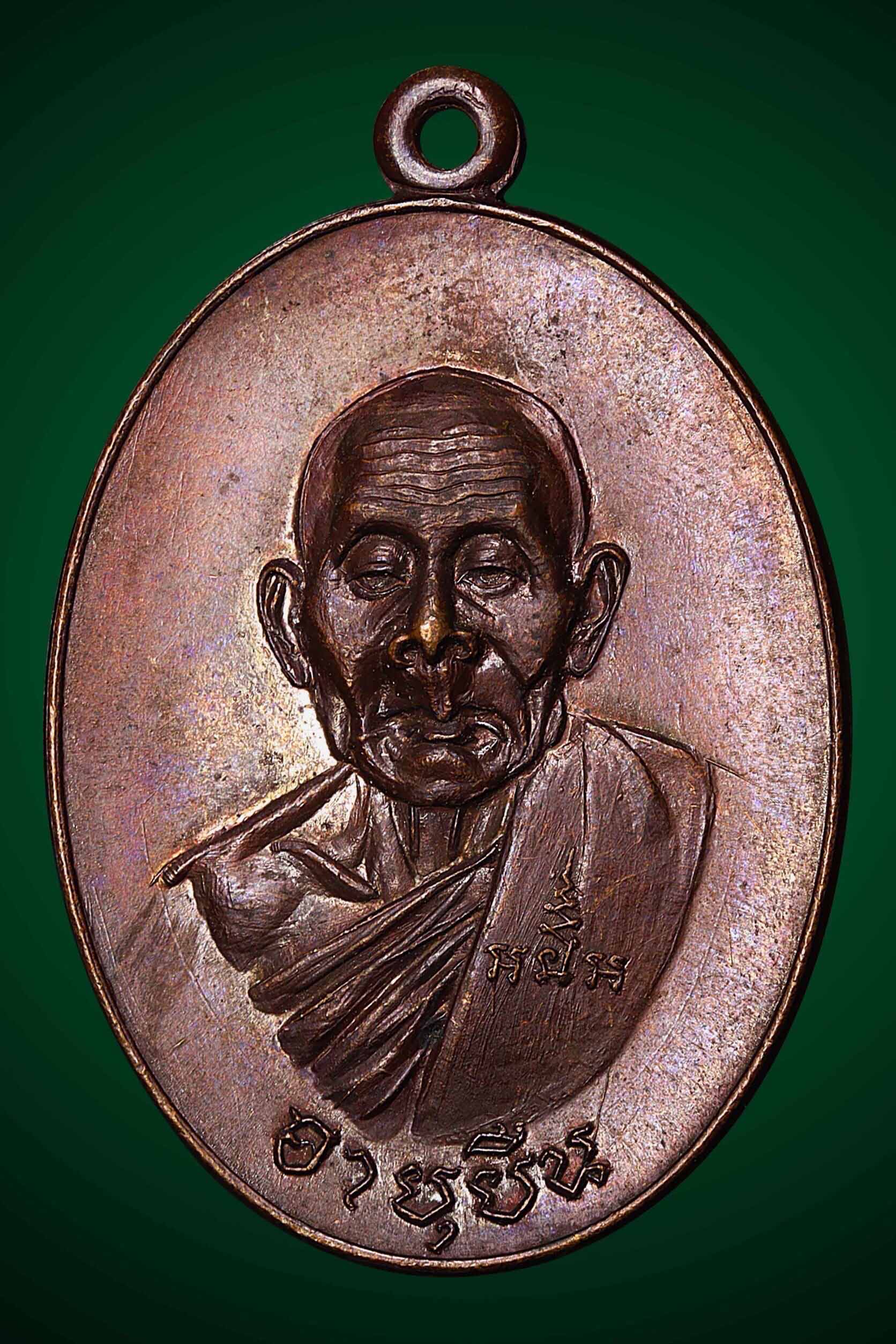 เหรียญหลวงปู่สี วัดเขาถ้ำบุญนาค รุ่นอายุยืน พิมพ์ครึ่งองค์ ปี 2517 เนื้อทองแดงรมดำ จังหวัดนครสวรรค์
