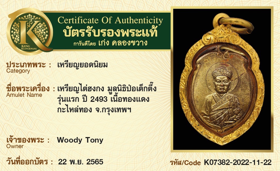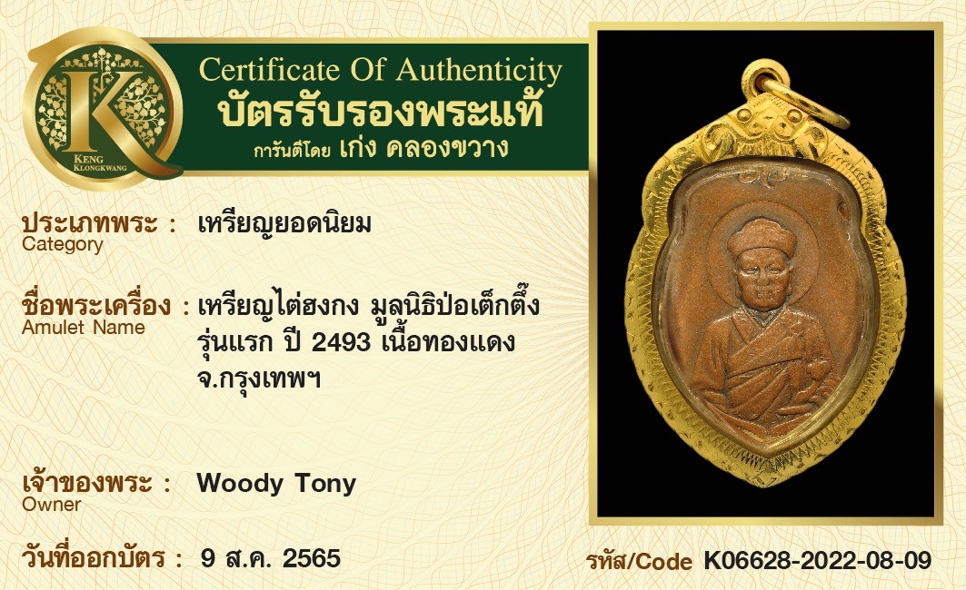เหรียญไต่ฮงกง มูลนิธิป่อเต็กตึ๊ก รุ่นแรก ปี 2493 เนื้อทองแดงกะไหล่อทอง จ.กรุงเทพฯ