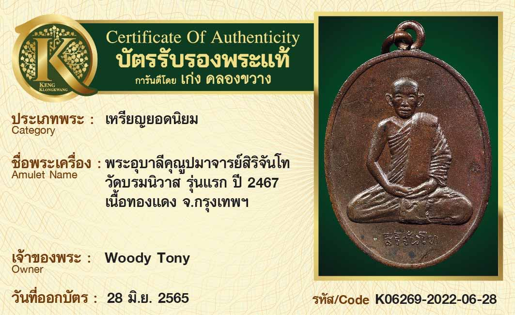 เหรียญพระอุบาลีคุณูปมาจารย์สิริจันโท วัดบรมนิวาส รุ่นแรก ปี 2467 เนื้อทองแดง จ.กรุงเทพฯ