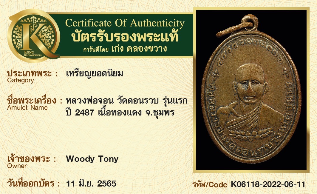 เหรียญหลวงพ่อจอน วัดดอนรวบ รุ่นแรก ปี 2487 เนื้อทองแดง จังหวัดชุมพร