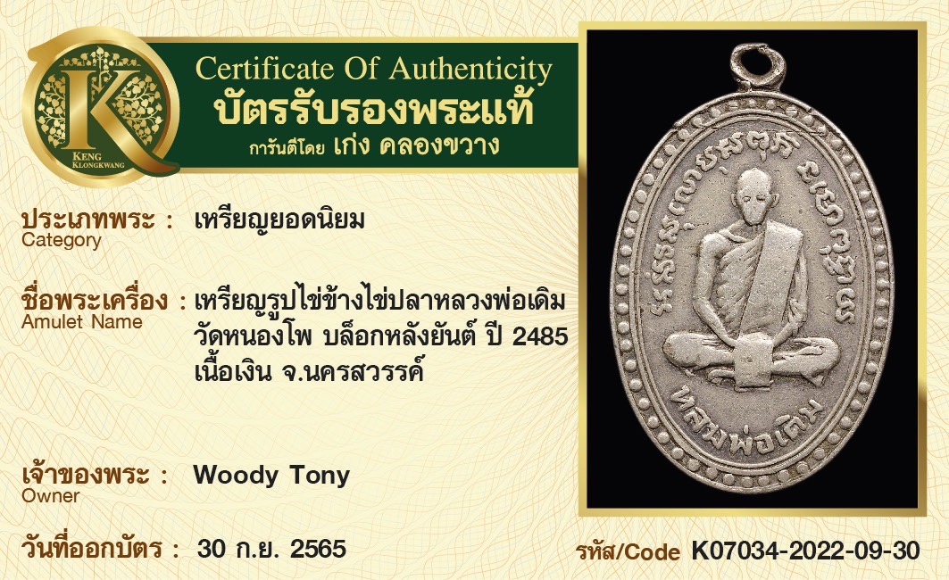 เหรียญข้างไข่ปลา หลวงพ่อเดิม วัดหนองโพ บล็อกหลังยันต์ ปี 2485 เนื้อเงิน จังหวัดนครสวรรค์