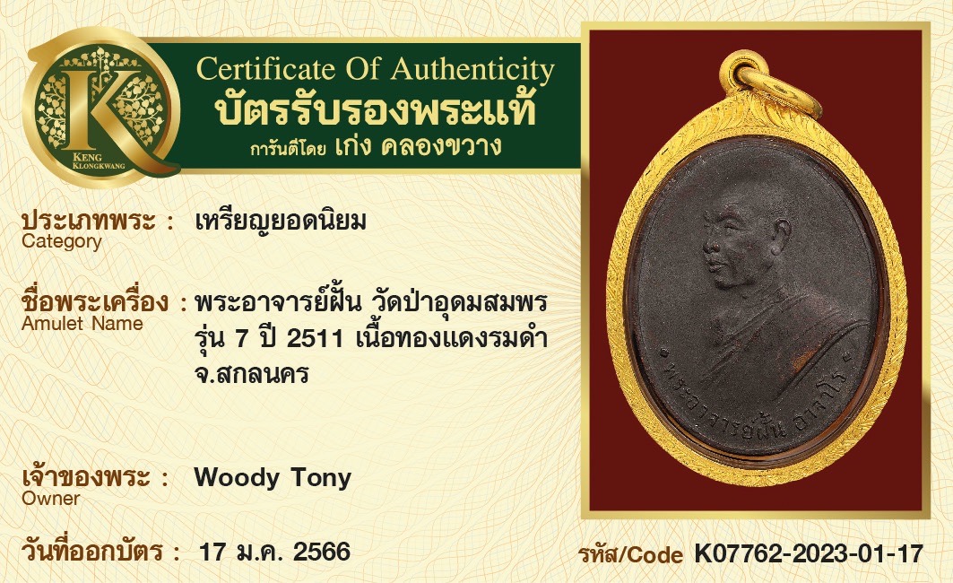 เหรียญพระอาจารย์ฝั้น วัดป่าอุดมสมพร รุ่น 7 ปี 2511 เนื้อทองแดงรมดำ จังหวัดสกลนคร