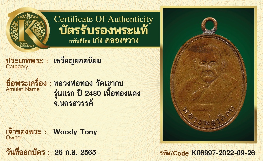 เหรียญหลวงพ่อทอง วัดเขากบ รุ่นแรก ปี 2480 เนื้อทองแดง จ.นครสวรรค์