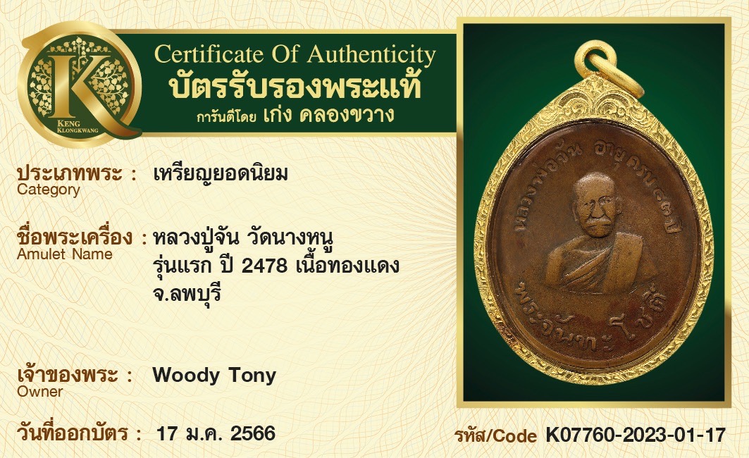 เหรียญหลวงปู่จัน วัดนางหนู รุ่นแรก ปี 2478 เนื้อทองแดง จังหวัดลพบุรี