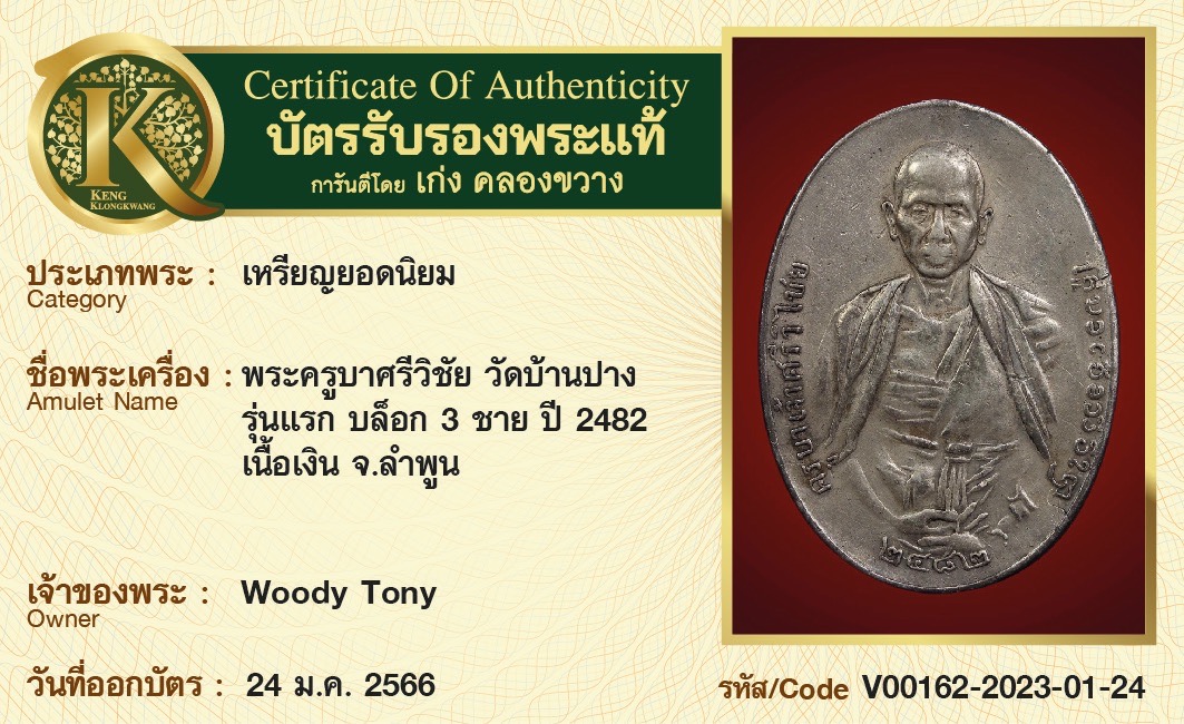 เหรียญพระครูบาศรีวิชัย วัดบ้านปาง รุ่นแรก บล็อก 3 ชาย ปี 2482 เนื้อเงิน จ.ลำพูน