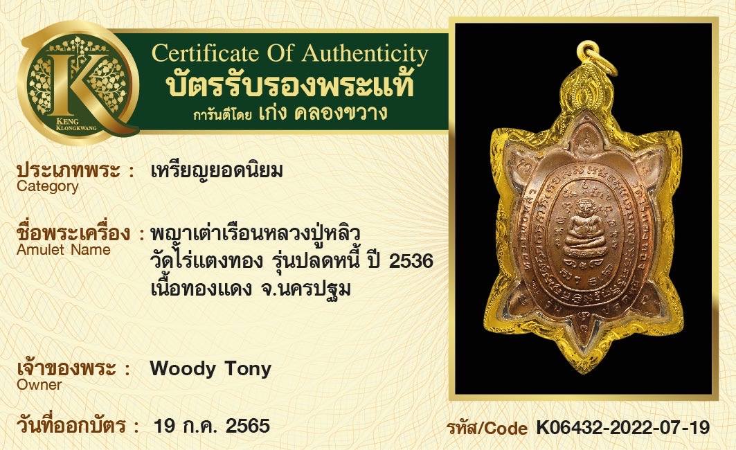 เหรียญพญาเต่าเรือน หลวงปู่หลิว วัดไร่แตงทอง รุ่นปลอดหนี้ ปี 2536 เนื้อทองแดง จ.นครปฐม