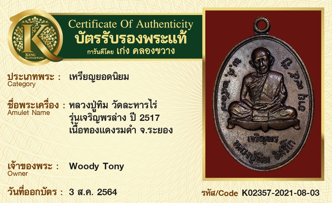 เหรียญหลวงปู่ทิม วัดละหารไร่ รุ่นเจริญพรล่าง ปี 2517 เนื้อทองแดงรมดำ จังหวัดระยอง