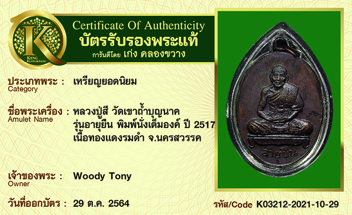 เหรียญหลวงปู่สี วัดเขาถ้ำบุญนาค รุ่นอายุยืน พิมพ์นั่งเต็มองค์ ปี 2517 เนื้อทองแดงรมดำ จังหวัดนครสวรรค์