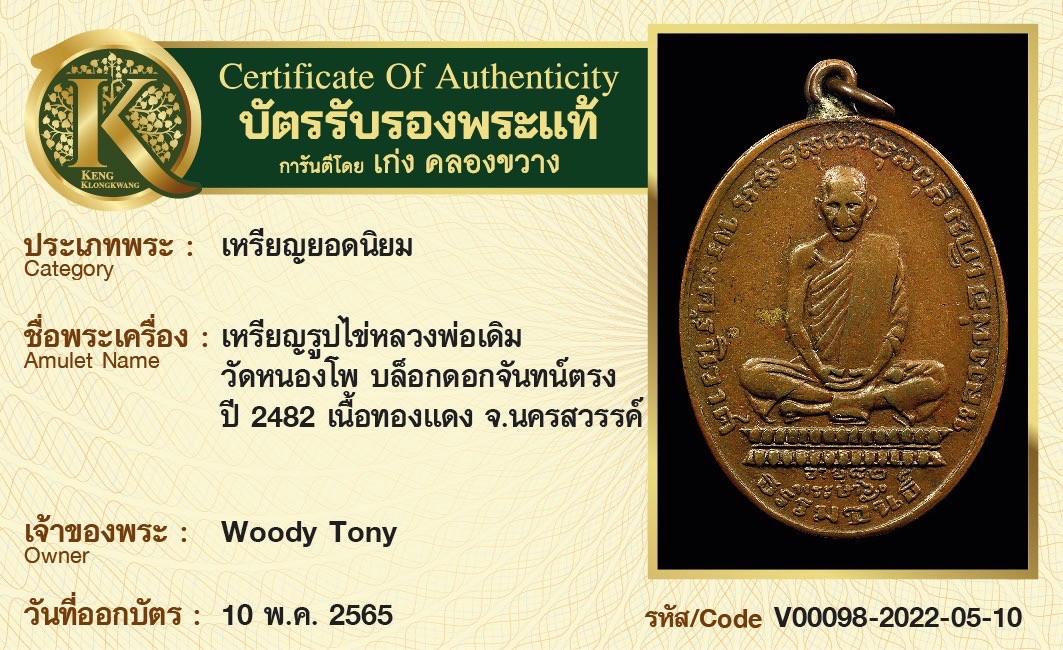 เหรียญรูปไข่หลวงพ่อเดิม วัดหนองโพ บล็อกดอกจันทน์ตรง ปี 2482 เนื้อทองแดง จังหวัดนครสวรรค์