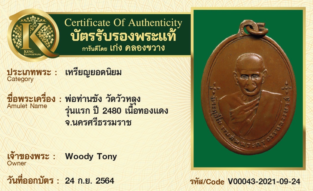 เหรียญพ่อท่านซัง วัดวัวหลุง รุ่นแรก ปี 2480 เนื้อทองแดง จังหวัดนครศรีธรรมราช