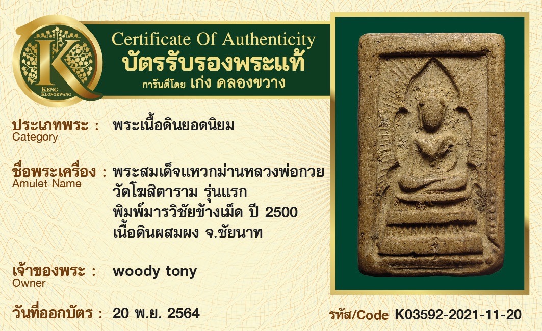 พระสมเด็จแหวกม่านหลวงพ่อกวย วัดโฆสิตาราม รุ่นแรก พิมพ์มารวิชัยข้างเม็ด ปี 2500 เนื้อดินผสมผง จังหวัดชัยนาท