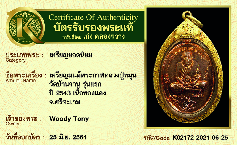 เหรียญมนต์พระกาฬหลวงปู่หมุน วัดบ้านาน รุ่นแรก ปี 2543 เนื้อทองแดง จังหวัดศรีสะเกษ