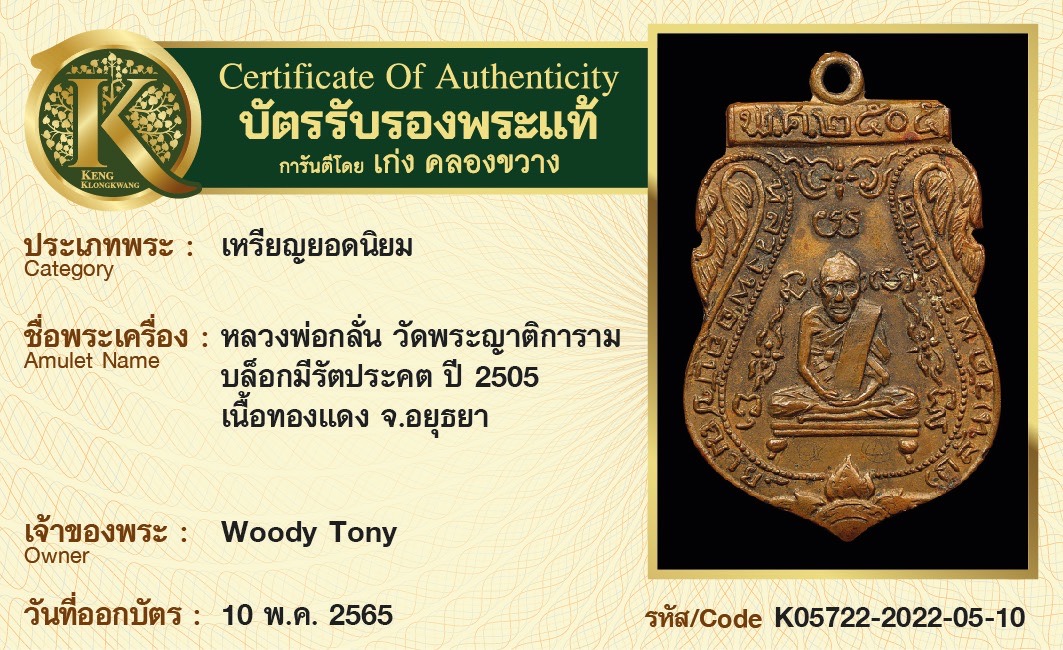 เหรียญหลวงพ่อกลั่น วัดพระญาติการาม บล็อกมีรัตประคต ปี 2505 เนื้อทองแดง จังหวัดอยุธยา