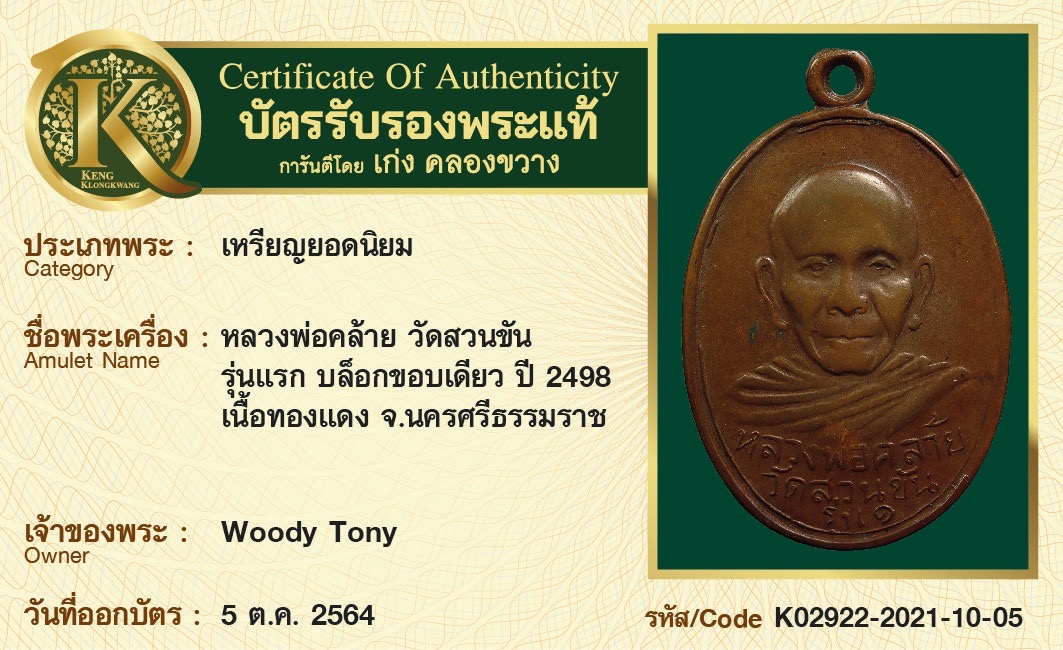 เหรียญหลวงพ่อคล้าย วัดสวนขัน รุ่นแรก บล็อกขอบเดียว ปี 2498 เนื้อทองแดง จังหวัดนครศรีธรรมราช
