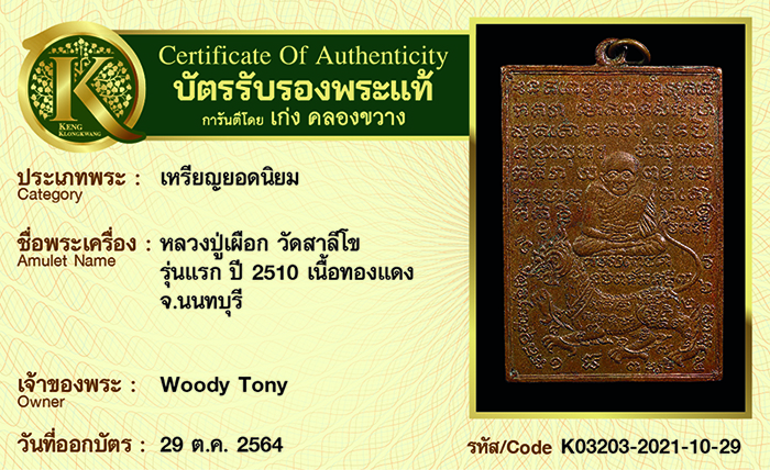 เหรียญหลวงปู่เผือก วัดสาลีโข รุ่นแรก ปี 2510 เนื้อทองแดง จังหวัดนนทบุรี
