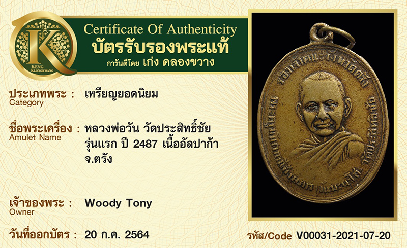 เหรียญหลวงพ่อวัน วัดประสิทธิ์ชัย รุ่นแรก ปี 2487 เนื้ออัลปาก้า จังหวัดตรัง