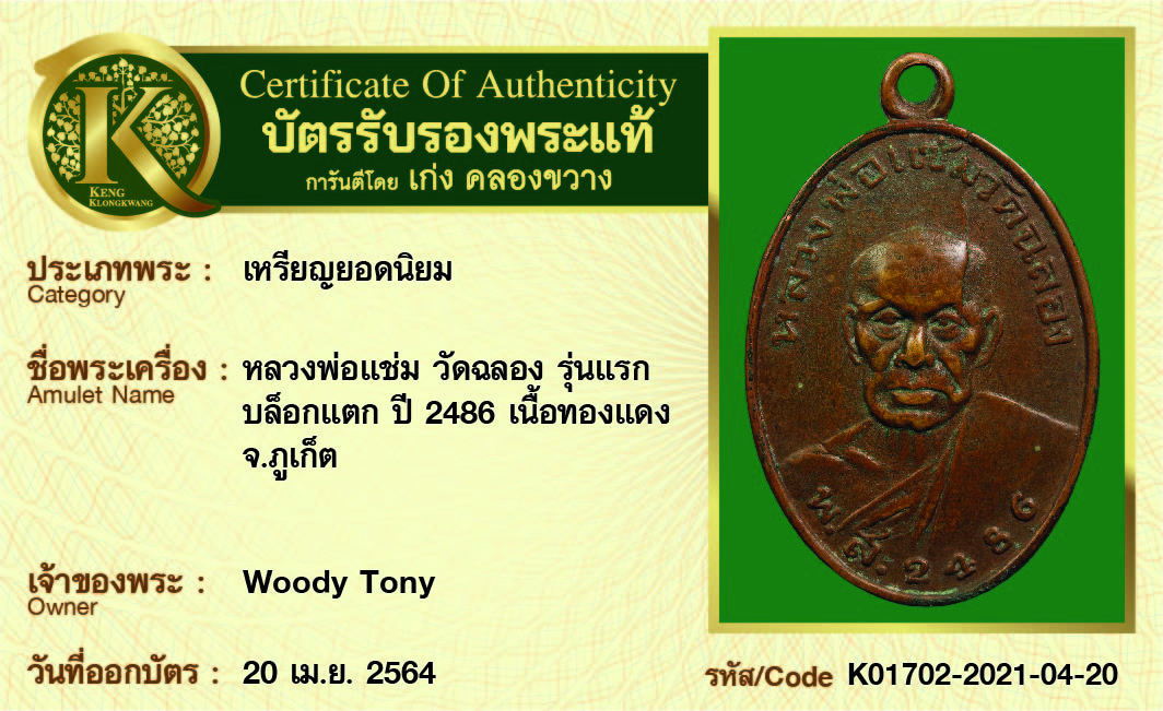 เหรียญหลวงพ่อแช่ม วัดฉลอง รุ่นแรก บล็อกแตก ปี 2486 เนื้อทองแดง จังหวัดภูเก็ต
