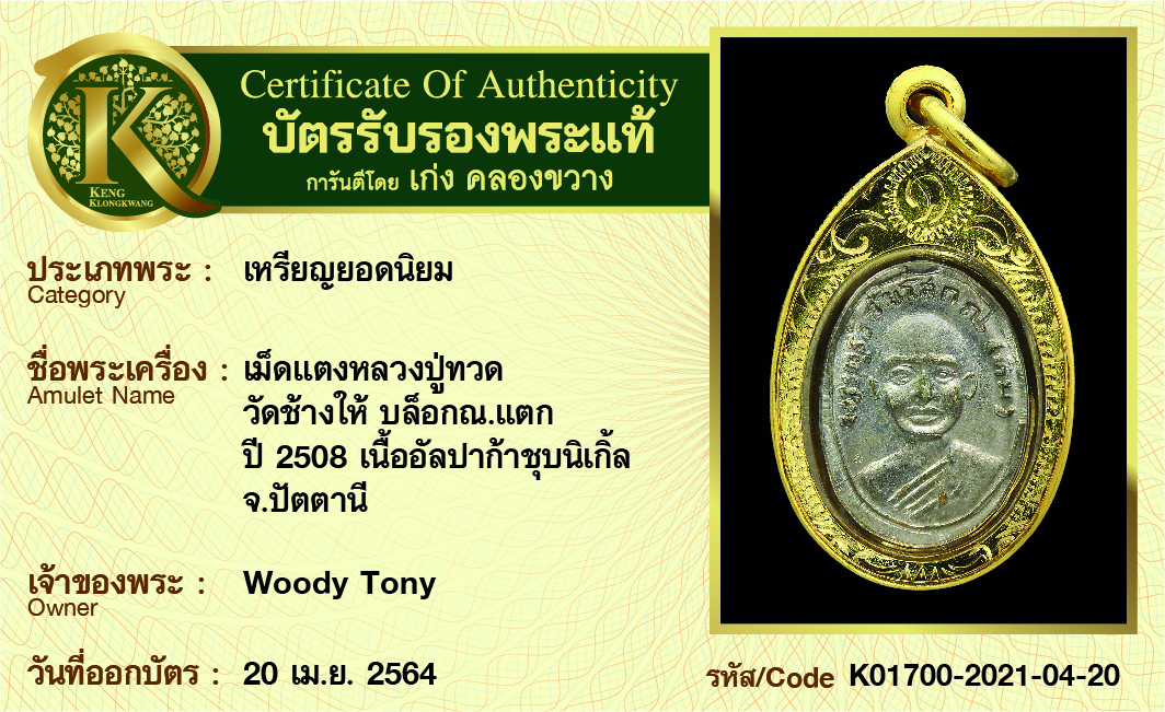 เหรียญเม็ดแตงหลวงปู่ทวด วัดช้างให้ บล็อก ณ.แตก ปี 2508 เนื้ออัลปาก้ากะไหล่ทอง จังหวัดปัตตานี