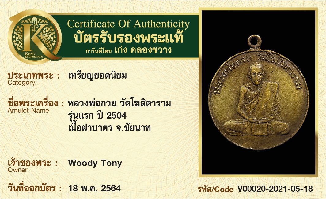 เหรียญหลวงพ่อกวย วัดโฆสิตาราม รุ่นแรก ปี 2504 เนื้อฝาบาตร จังหวัดชัยนาท